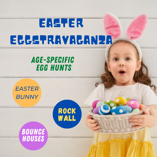 Everyone is invited for a fun time with a Climbing Wall, Bounce Houses, Crafts, Photos with the Easter Bunny, and of course several age-specific Easter egg hunts.